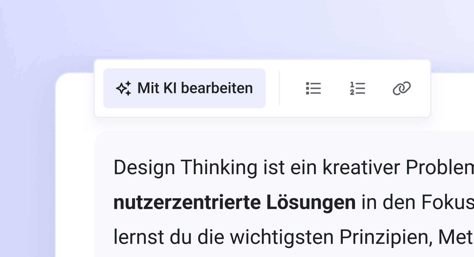 Beschreibe der KI, worum es in deinem Kurs geht. Sie stellt dir gezielte Fragen und sammelt Informationen zu Thema, Zielgruppe und Lernziel. Zusätzlich kannst du Dokumente hochladen, an denen sie sich orientiert.